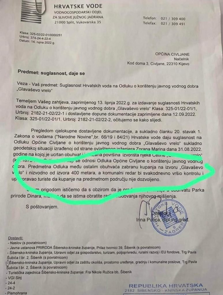 Odlukom o korištenju javnog vodnog dobra „Glavaševo vrelo“ i Hrvatske vode su zabranile kupanje na Izvoru koji je posljednjih godina postao prava turistička atrakcija zbog svoje prirodne ljepote.