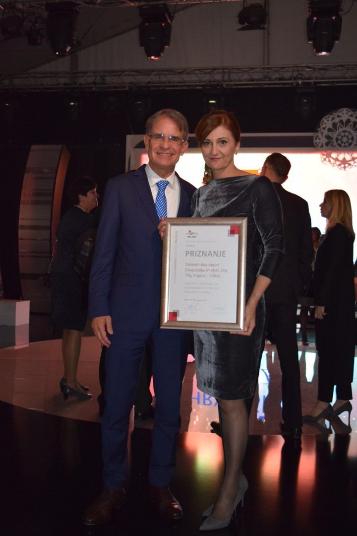 Medu finalistima u sklopu Dana hrvatskog turizma u kategoriji – Destinacija godine, najuspješnija destinacija ruralnog turizma, našla se i Dalmatinska zagora koja obuhvaća Sinj, Trilj, Imotski, Vrgorac, Vrliku i Dugopolje. Prvu nagradu osvojila je destinacija Baranja, a Dalmatinska zagora osvojila je treće mjesto. Na jučerašnjoj dodjeli nagrada u Malom Lošinju ispred destinacije Dalmatinska zagora nagradu je preuzela sinjska gradonačelnica Kristina Križanac u pratnji vrgoračkog gradonačelnika Ante Pranjića. Gradonačelnica je izrazila zadovoljstvo sto je Dalmatinska zagora prepoznata kao nova turistička ponuda u smjeru razvoja ruralnog turizma koji se izuzetno dobro nadopunjuje na turizam Jadranske obale, te je naglasila važnost objedinjavanja turističke ponude ruralnih područja.